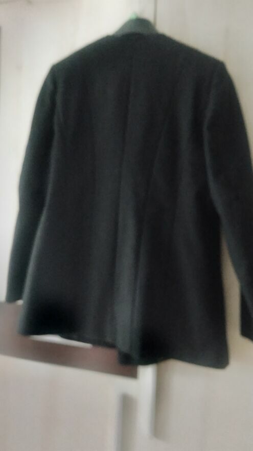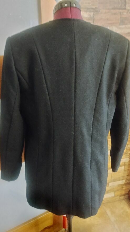 Czarny flauszowy płaszczyk bez kołnierza zapinany na guzikiMa kryte kieszonki w szwie posada podszewkę